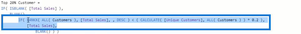 總而言之,函數需要刪除客戶上下文並僅根據總銷售額對所有內容進行排名。然後,如果客戶小於唯一身份客戶總數加上產品乘以0.20,則返回Total Sales。