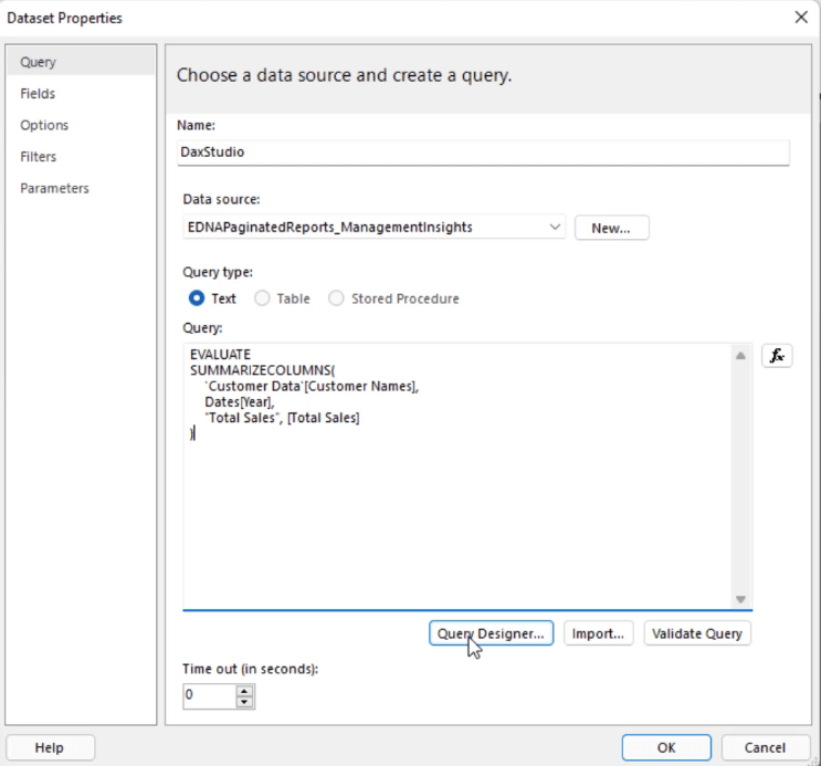 這是您開始創建分頁報告的地方。輸入你想要的數據集名稱並選擇數據源。然後,選擇查詢設計器。