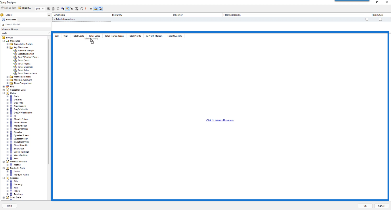 請注意,可以在查詢設計器的度量值組窗格中找到 LuckyTemplates 數據模型中的表和所有數據。