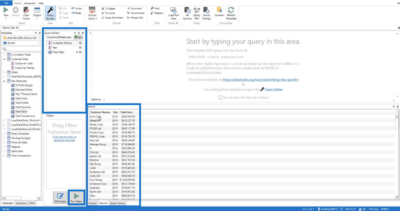 打開 DAX 工作室。再次選擇您需要的 LuckyTemplates 模型,然後單擊“連接”。在 DAX Studio 中粘貼查詢。