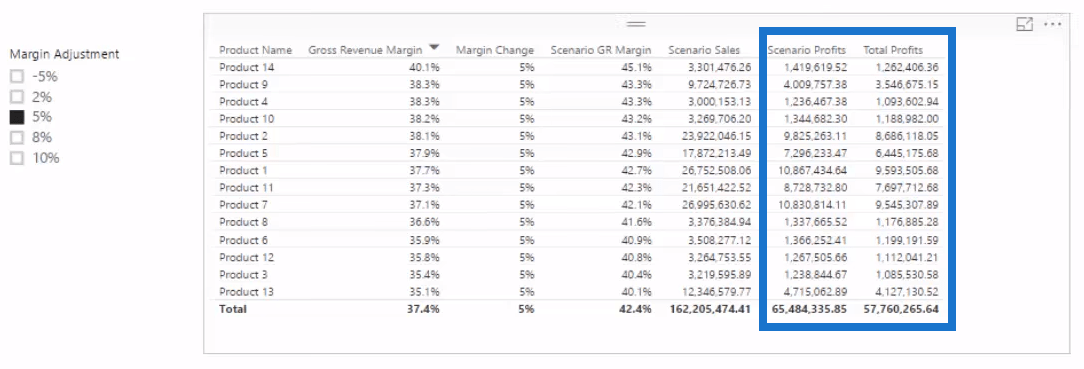 讓我們為場景毛利率創建一個新度量,它是毛利率和利潤變化的總和。一旦我們將此度量值拖入我們的表中,您會注意到,隨著我們在 Margin Adjustment 表中進行選擇,Scenario Gross Revenue Margin 列下的百分比數字會發生變化。