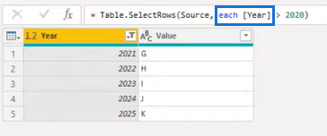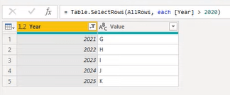 讓我們看一個 Power Query 中的示例。目標是過濾以僅顯示大於 2020 年的年份。