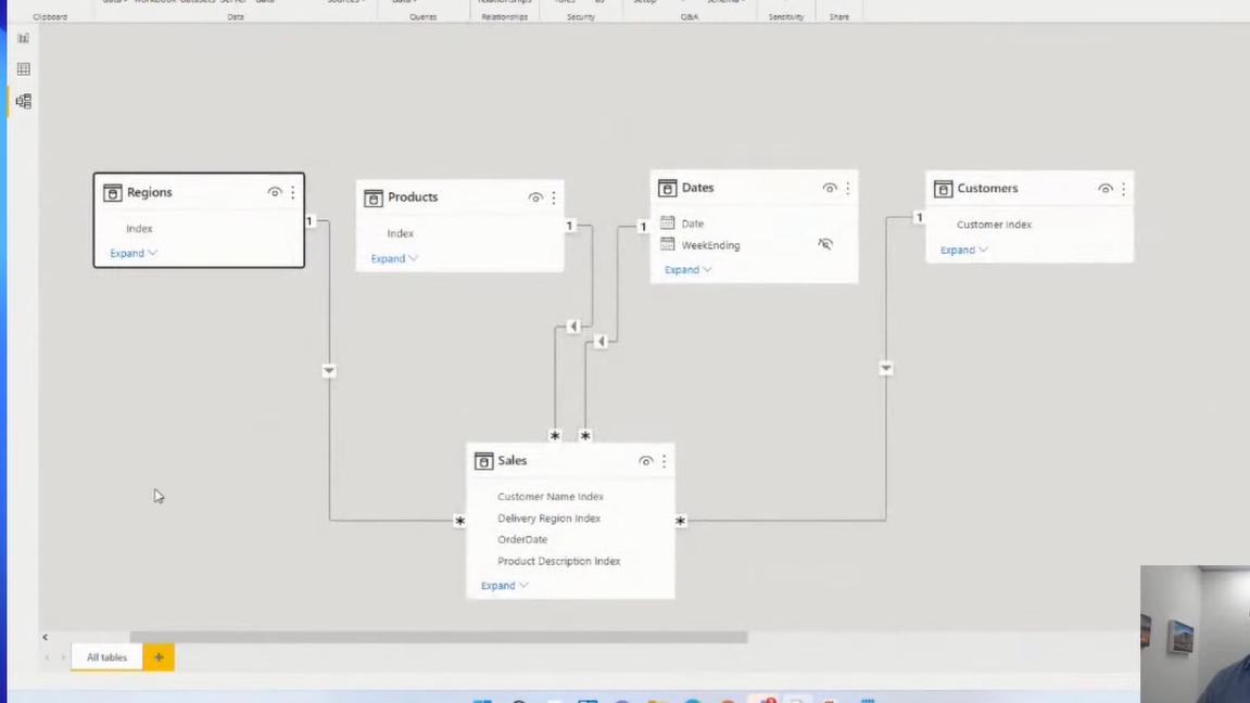 在這個例子中,我使用瀑布技術創建了一個簡單的模型,其中我們的查找表位於頂部,向下流向我們的事實表。這是一個簡單的數據集。我們有一個銷售東西的組織和一個事實表,其中包含業務中發生的所有不同交易。