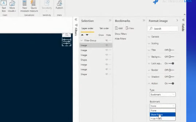 接下來,我要創建兩個書籤。一個是顯示過濾器,另一個是隱藏過濾器。此時我需要做的就是將這些書籤鏈接到這些圖像的選擇。為此,我將單擊圖像,然後轉到“格式圖像”窗格下的“操作”並將其打開。我將為類型選擇書籤,為書籤選擇顯示過濾器。