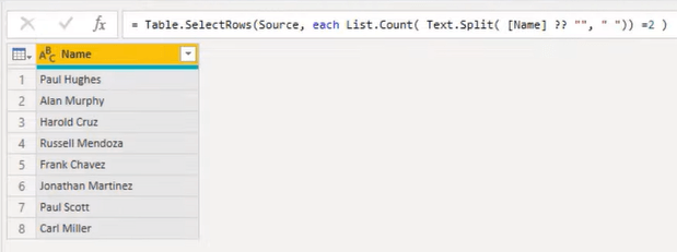 接下來,更新語法以過濾掉不包含兩個單詞的字符串。由於兩個單詞通常用空格分隔,因此您需要使用Text.Split命令。然後,您需要將它放在List.Count函數中,以便結果返回一個值列表。