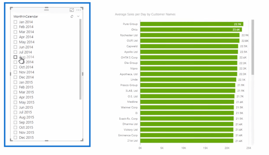 正如您在下圖中看到的,當我們選擇 2014 年 8 月時,視覺對象會顯示該時間範圍內的數據。