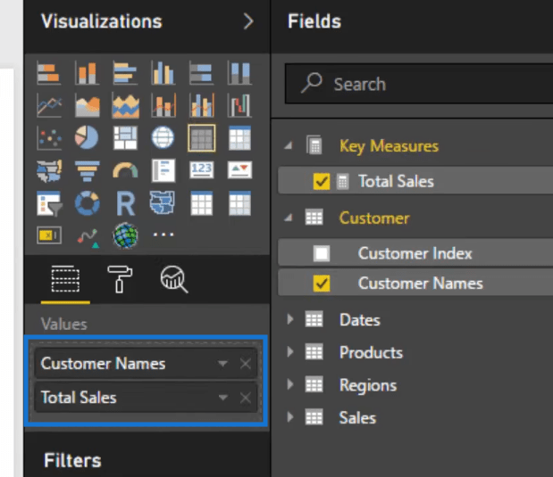 使用我們的數據模型中的信息和已有的度量,讓我們按客戶分析我們的總銷售額。