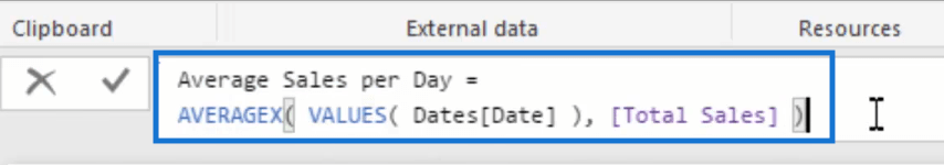 因此,讓我們創建一個新度量並將其稱為Average Sales per Day。