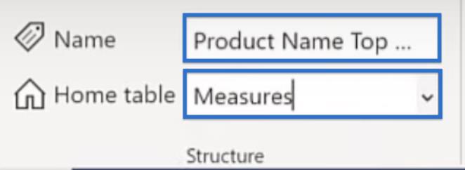 在Measure tools下的功能區中,將Name設置為Product Name Top Ranking Total Sales並為主表選擇Measures 。