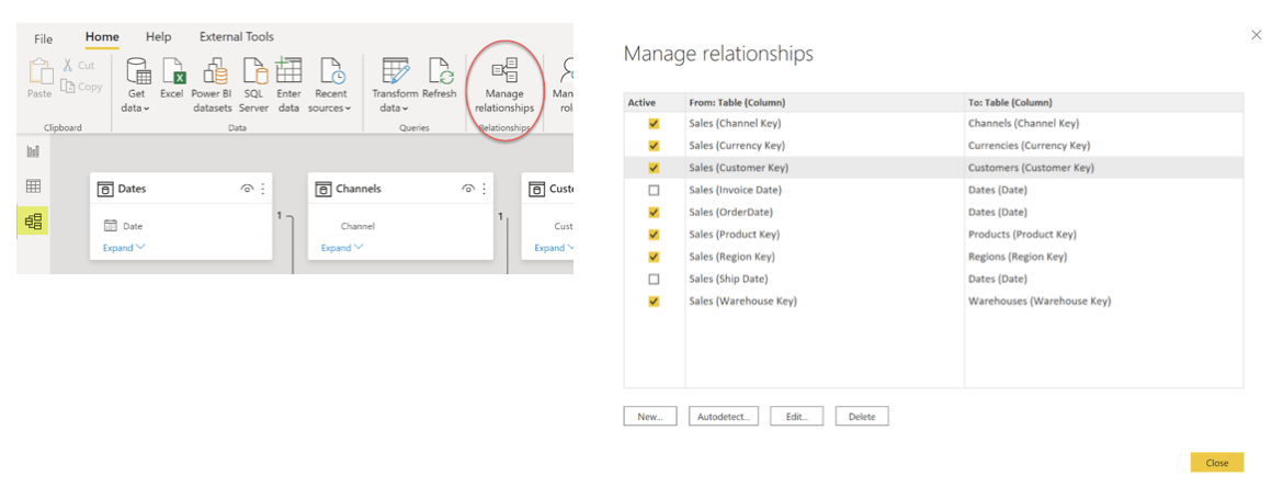 “管理關係”對話框允許您查看所有表和列之間關係的完整列表。在這裡您可以輕鬆地發現和更正用於連接表的鍵(列)。您還將看到(並且可以更改)每個關係的狀態(活動、非活動)。要打開此對話框,請單擊模型視圖主工具欄關係部分中的管理關係圖標。