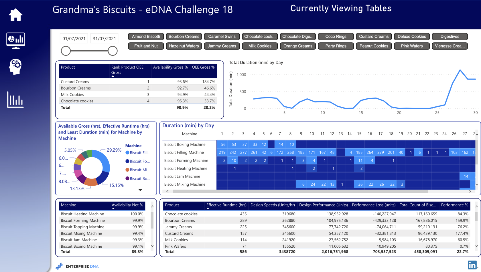 我們最喜歡的 power bi 儀表板示例之一。一個組織良好、清晰、簡潔的 LuckyTemplates 分析儀表板,通過創造性的可視化技術展示 OEE 或整體設備效率。