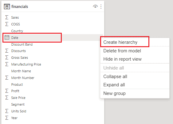 將創建一個新的層次結構,並將所選字段作為其級別。您可以在右側的“字段”窗格中看到層次結構。