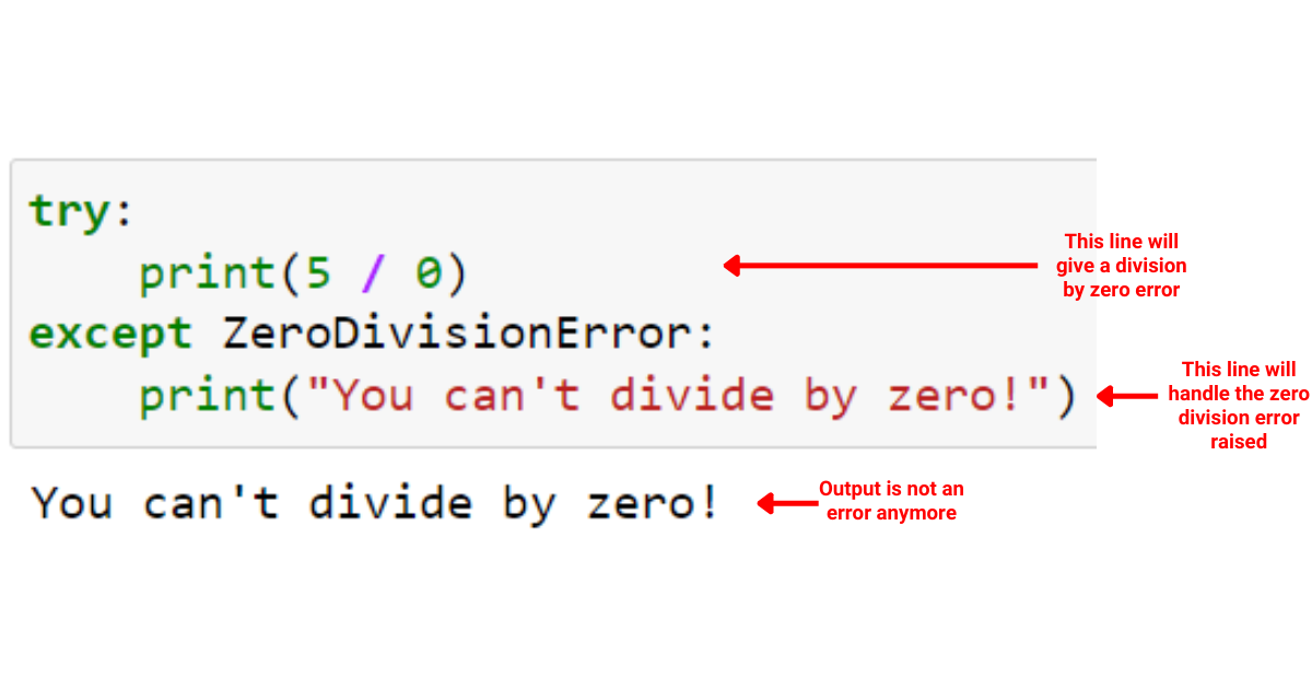try: print(5 / 0) except ZeroDivisionError: print("You can't divide by zero!")